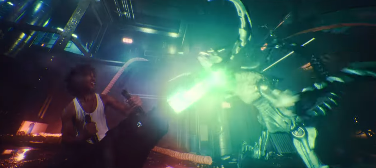 Louise puts on her helmet and chases her, confronts Vic and takes off a katana from the wall leaving the laboratory chasing Vic
